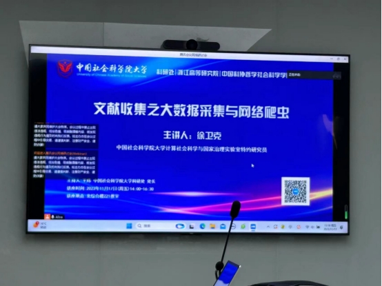 11月17日下午,中国社会科学院大学计算社会科学与国家治理实验室特约研究员徐卫克老师应邀作题为“文献收集之大数据采集与网络爬虫”的讲座,讲座由中国社会科学院大学科研处处长王炜主持,99直播