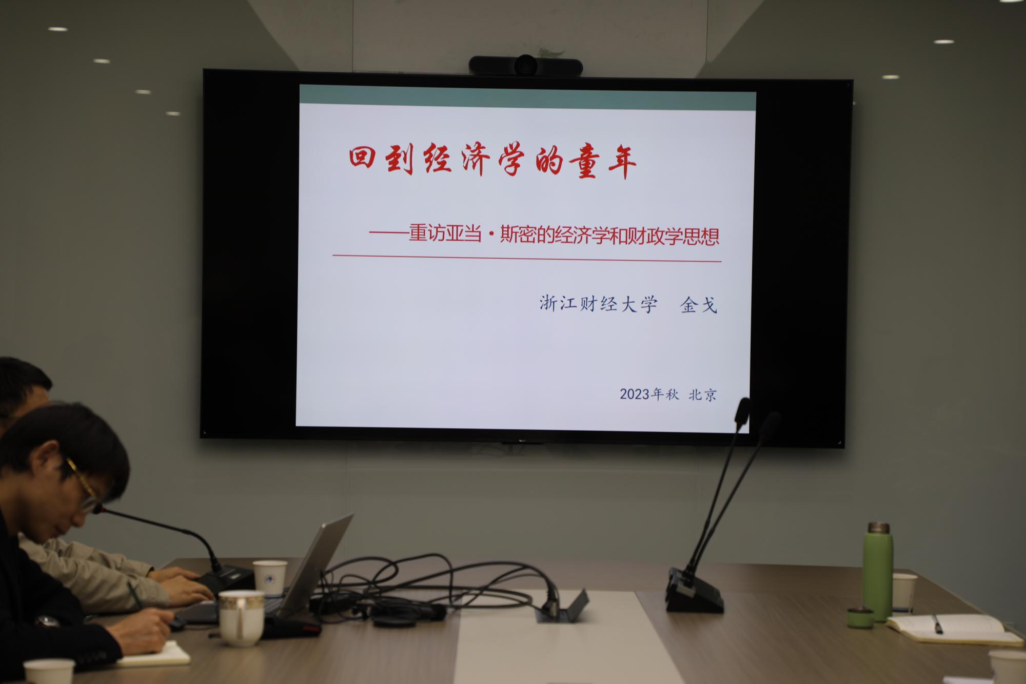 2023年11月28日,浙研院学科交叉系列讲座第二十二期在4号楼206如期举行。浙江财经大学财税学院金戈教授以“回到经济学的童年—重访亚当·斯密的经济学和财政学思想”为主题,阐释了亚当·斯密的思想脉络和学说体系,并探讨了其思想和智慧对当下中国经济发展的启示。本场讲座由浙研院执行院长童光辉主持。