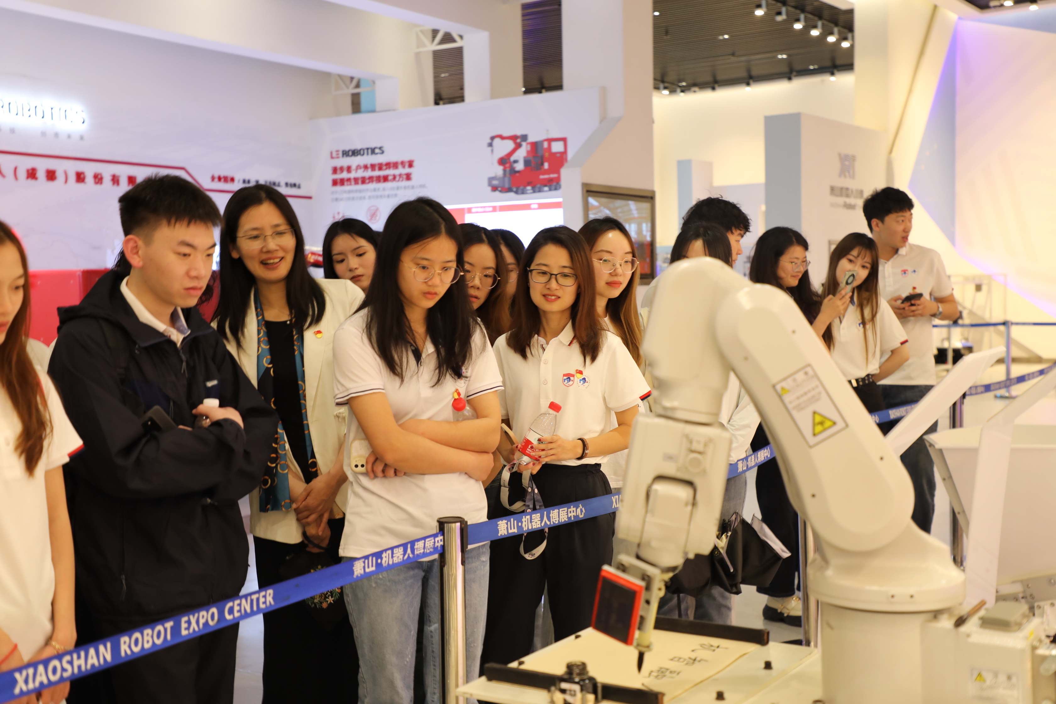 师生党员们首站来到萧山机器人小镇,在讲解员的带领下,党员们了解了许多有趣又实用的机器人,自动监测灭火机器人、凯尔达焊接机器人、西门子智能机器人、机器人狗等。在工作人员的指引下,党员们和机器人进行了亲切地“交流”:和机器人下五子棋和象棋,让机器人写毛笔字、跳舞、唱歌,进行VR虚拟骑行等。通过与高科技机器人的互动体验,师生党员深刻感受到了数字技术、人工智能等新一代信息技术融入传统产业带来的全要素生产率的提升,体会到了发展新质生产力能够促进我国制造业向高端化、高效能、高质量的方向发展。