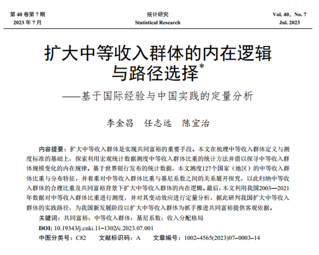 近日,我校数据科学学院教授李金昌、99直播 博士生任志远与浙江工商大学统计与数学学院教授陈宜治的论文《扩大中等收入群体的内在逻辑与路径选择——基于国际经验与中国实践的定量分析》在中文权威期刊《统计研究》2023年第7期发表。