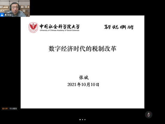 10月11日晚,中国社会科学院大学(中国社会科学院研究生院)党委常委、副校长(副院长)张斌研究员应邀以在线形式作题为“数字经济时代的税制改革”专题讲座。本次讲座由副校长王奎泉教授主持。