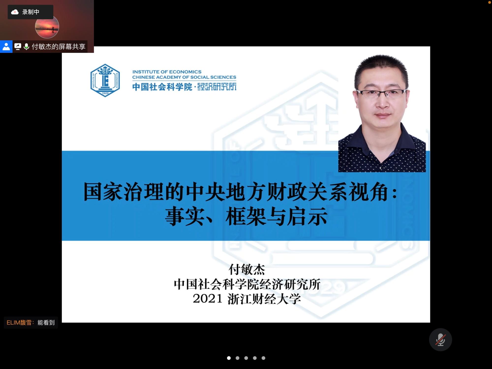 10月21日晚,中国社会科学院经济研究所副研究员,中国社会科学院大学副教授、经济系硕士生导师付敏杰教授应邀作题为“国家治理的中央地方财政关系视角:事实、框架与启示”的专题讲座。本次讲座由童光辉老师主持,浙江研究院全体学生以在线形式进行观看。