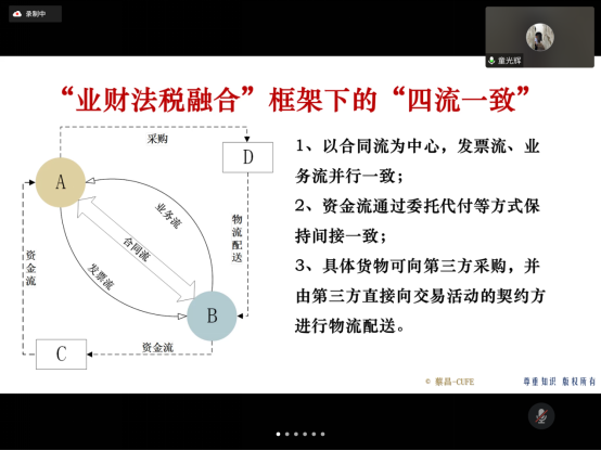 蔡昌教授分别从“新税收征管与金税四期、数字财税管理重点与模式创新、业财法税融合:税务合理性实践”三方面进行讲述。讲座过程中,蔡昌教授结合自身经历与研究,列举了众多生动形象的例子,也通过图表等方式把晦涩的交叉学科知识化繁为简,将金税四期改革、新时期税收筹划、AI经济等内容娓娓道来。蔡昌教授还勉励同学们,要与时俱进,实现经济社会发展的专业与技术双轮驱动。讲座最后,蔡昌教授还对同学提出的问题进行了详细的解答。
