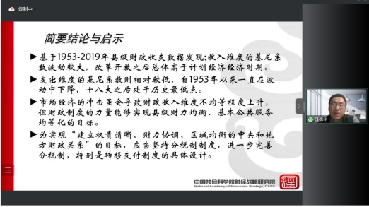 汪德华研究员首先阐述了研究县级财力不均等的动因与长周期研究的必要性。其次,汪德华研究员通过基尼系数等指标,结合相关制度背景,描绘并分析此前70年间中国县级财力不均等的演变趋势并对县级财力不均等的来源与结构做了探讨与分析。讲座最后,童光辉副教授进行了简短有力地总结,并热情邀请汪德华研究员来浙调研。