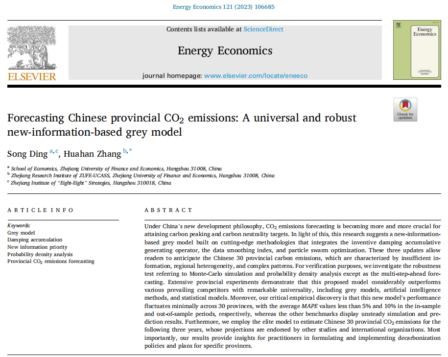 硕士生张华汉的论文《Forecasting Chinese provincial CO2emissions: A universal and robust new-information-based grey model》在国际顶级能源经济与管理领域期刊Energy Economics(SSCI,IF=9.252,二区Top)上发表。