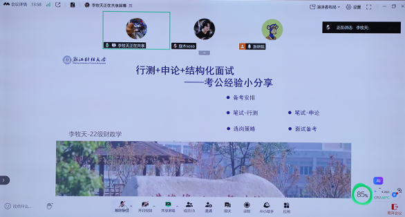 2022级财政学硕士研究生李牧天结合自身从“公考小白”到成功上岸的经历,系统梳理考公核心知识,分享备考与选岗的实用策略,内容干货满满,让在场同学对考公有了清晰的认知与规划方向。