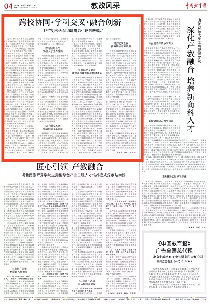 2月19日,《中国教育报》第四版以《跨校协同·学科交叉·融合创新——浙江财经大学构建研究生培养新模式》为题,从人才培养、科学研究、课程与教材建设、校际合作等方面详细报道了我院研究生培养的探索与实践。报道指出,浙研院以新财经改革为引领,着力构建研究生“新培养体系”,探索“跨校协同·学科交叉·融合创新”的研究生教育新机制和新模式,育人成效显著。