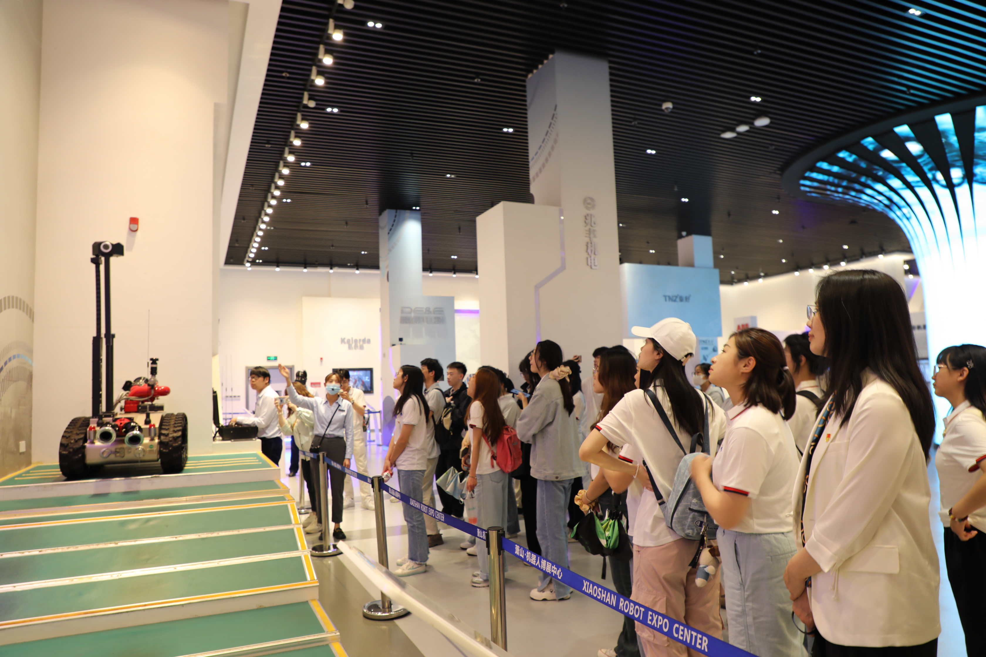 师生党员们首站来到萧山机器人小镇,在讲解员的带领下,党员们了解了许多有趣又实用的机器人,自动监测灭火机器人、凯尔达焊接机器人、西门子智能机器人、机器人狗等。在工作人员的指引下,党员们和机器人进行了亲切地“交流”:和机器人下五子棋和象棋,让机器人写毛笔字、跳舞、唱歌,进行VR虚拟骑行等。通过与高科技机器人的互动体验,师生党员深刻感受到了数字技术、人工智能等新一代信息技术融入传统产业带来的全要素生产率的提升,体会到了发展新质生产力能够促进我国制造业向高端化、高效能、高质量的方向发展。