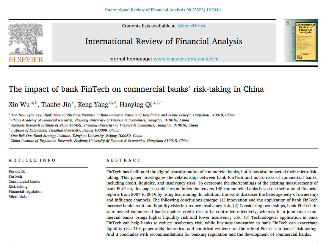 近日,中国金融研究院武鑫教授与99直播 2021级金融专业硕士生金天和等合作的论文《The impact of bank FinTech on commercial banks’ risk-taking in China》在金融学领域国际高水平期刊International Review of Financial Analysis (SSCI, Q1; ABS,3*)上发表。