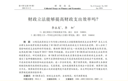 博士生李加的合作论文《财政立法能够提高财政支出效率吗?》在《财经论丛》2024年第4期发表。文章主要探究了从法律层面规范政府财政行为的新《预算法》的实施是否提高了财政支出效率。