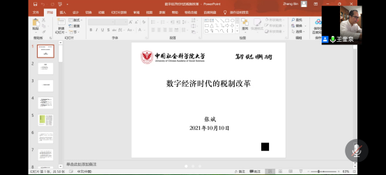 10月11日晚,中国社会科学院大学(中国社会科学院研究生院)党委常委、副校长(副院长)张斌研究员应邀以在线形式作题为“数字经济时代的税制改革”专题讲座。本次讲座由副校长王奎泉教授主持。
